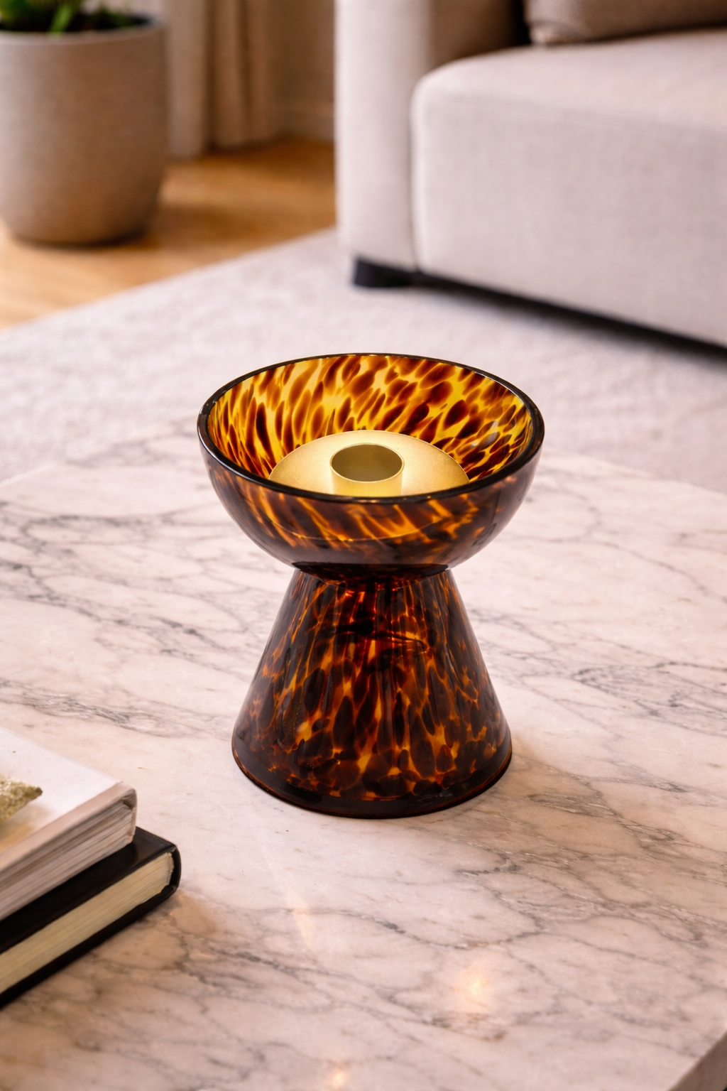 Designed for contemporary interiors and curated gift collections, this leopard-print candle holder pairs a striking hourglass silhouette with a luxurious gold interior for an immediate statement piece.