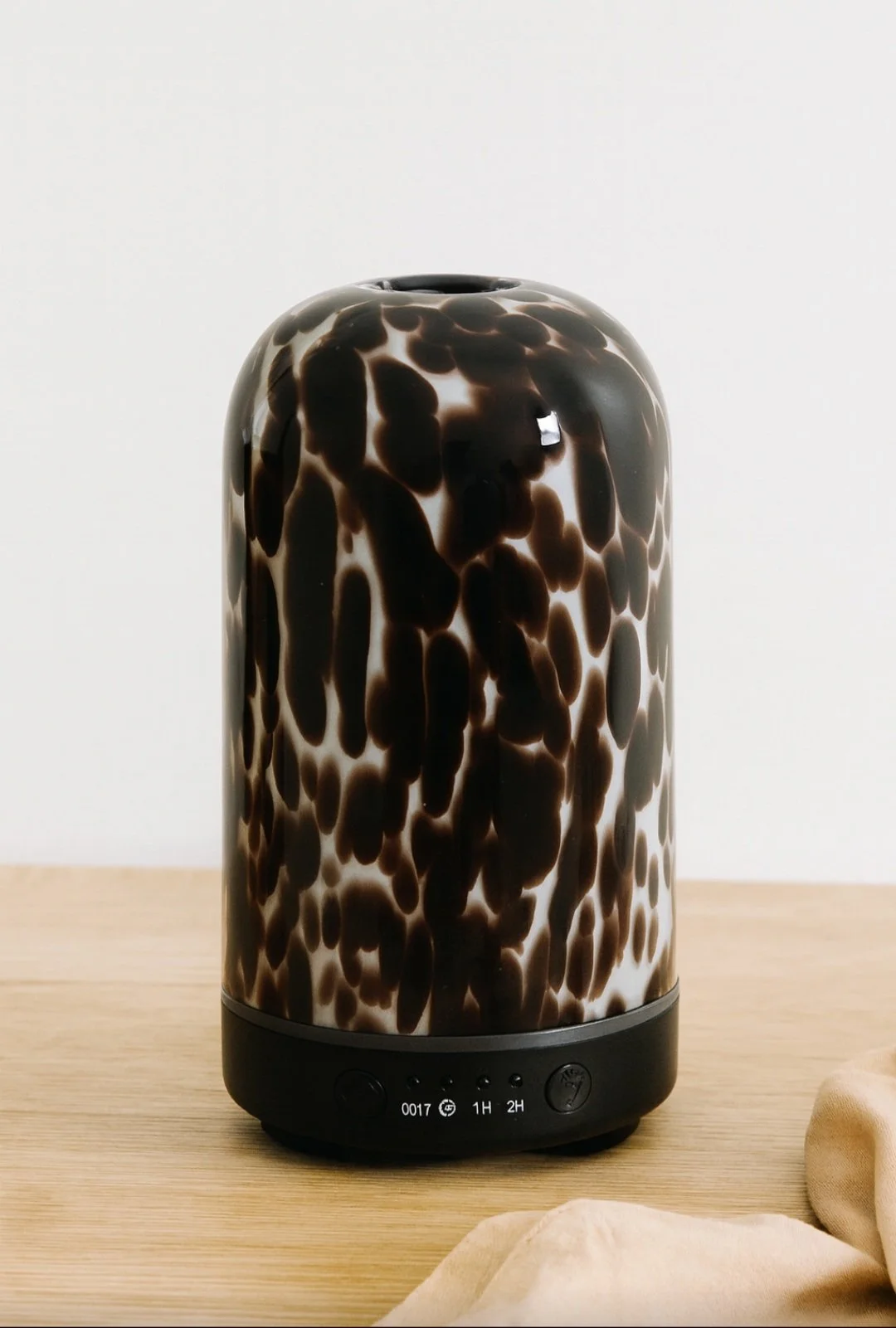This tortoiseshell electric diffuser brown marbled glass with a slim black base for a refined, on‑trend accent that elevates interior styling.