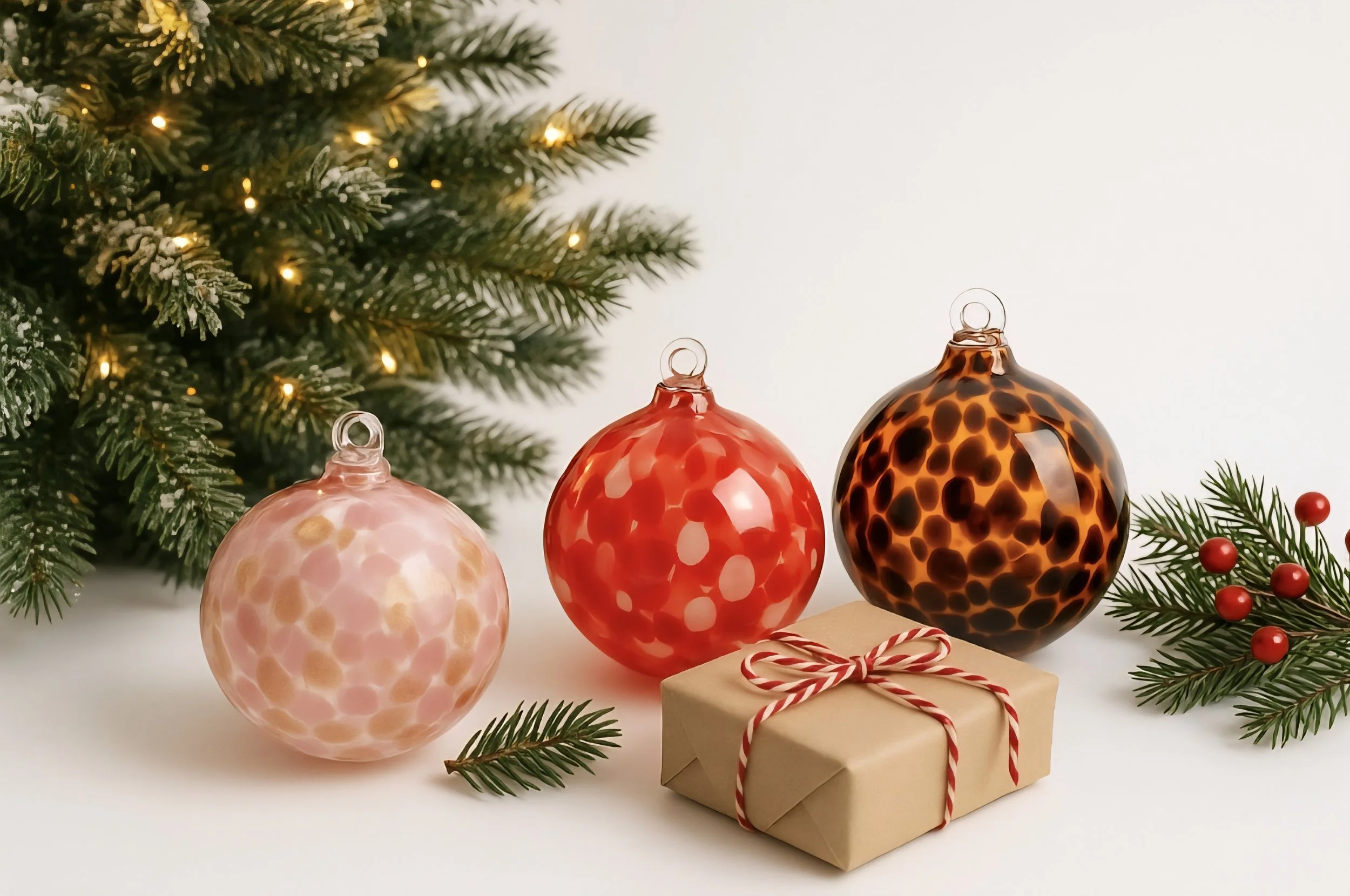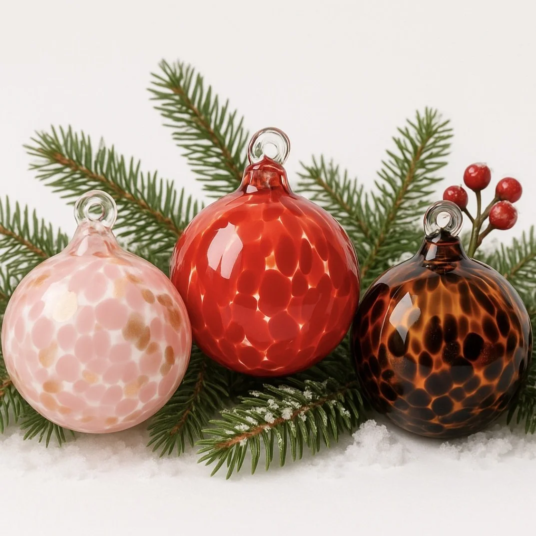 These hand-blown glass baubles feature a bold leopard print with bronze flecks that catch the light, adding modern glamour to any festive display.
